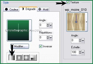 11 - Sélection/modifier/Contracter de 1 pixel Remplir de texture: wp_moire_010 dégradé linéaire configuré comme ci-dessous placé en avant-plan
