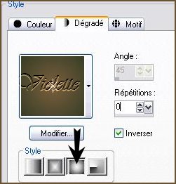 *** 1 - Ouvrir les tubes , les dupliquer et fermer les originaux 2 - Placer en avant-plan la couleur #373d27 et en arrière-plan la couleur #7a5f3d Configurer un dégradé halo /Répétition: 0/Inverser coché