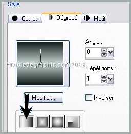 2 - Placer en avant-plan la couleur # 0F1B19 et en arrière-plan la couleur #CBD7D5Configurer un dégradé linéaire /angle : 0/Répétition: 1/Inverser non coché