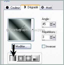 22 - Image/Ajouter des bordures : 1 pixel couleur noire23 - Image/Ajouter des bordures : 4 pixels couleur contrastanteSélectionner la bordure avec la baguette magique ( Tolérance et Progressivité à 0 ) remplir de dégradé linéaire angle: 45°/Répétitions: 3