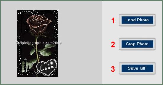 Nous allons la placer sur notre image 1 - clic sur Load Photos - aller chercher votre image dans votre dossier où vous avez rangé les fournitures de ce tutoriel 2 - clic sur Crop Photo - pour la recadrer : clic sur Crop 3 - clic sur Save Gif et enregistrer dans votre dossier