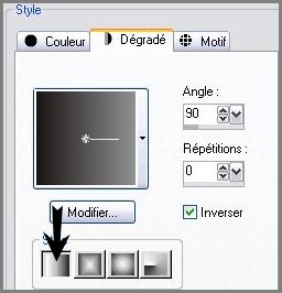 *** 1 - Ouvrir les tubes , les dupliquer et fermer les originaux 2 - Placer en avant-plan la couleur # 909092 et en arrière-plan la couleur #1B1515Configurer un dégradé linéaire angle: 90°/Répétition: 0/Inverser coché