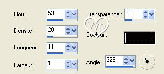 Finitions : 1 - Activer l’outil texte/choisir une Police/couleur foncée du scrap Ecrire votre nom ou le nom du scrap 2 - Si vous êtes satisfait Fusionner tous les calques Touches Alt + D faire une copie 3 – Sur l’image originale 4 – Image/Ajouter des bordures : 4 pixels de couleur contrastante/Sélectionner avec la baguette magique remplir de motif or 5 - Effets/Effets 3D/Ombre Portée Désélectionner 6 - Image/Ajouter des bordures : 20 pixels de couleur contrastante Sélectionner avec la baguette magique 7 - Reprendre la copie/Image/miroir/Edition/Copier/Edition/Coller dans la sélection 8 - Réglages/Flou/flou gaussien : rayon 30 9 – Effets/Effets de texture/Torchis