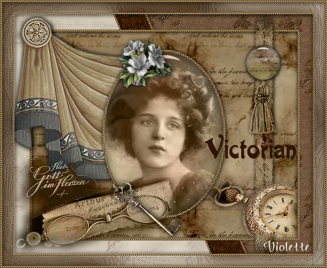 Partie 5 1 - Calques/Nouveau calque 2 - Sélection/charger :enregistrer une sélection/charger à partir du disque/sélection « Vic.4 » remplir du motif goldmuster 3 - Sélection/sélectionner tout/Sélection/Modifier/Contracter de 4 pixels Appuyer sur la touche Supprim. 4 - Calques/Nouveau calque/ Remplir avec le motif "victorian-flower.bmp" 5 - Réglages/Flou/flou gaussien : rayon 30 6 - Activer le bouton « victorian_scrap_butt_005_git »/ Edition/Copier/Edition/Coller dans la sélection 7 - Mode du calque/ Lumimance héritée Désélectionner 8 -Fermer les calques sauf les trois qui concernent ce médaillon 9 - Fusionner les calques visibles 10 - Effets/Effets 3D/Ombre Portée Ouvrir les calques fermés 11 - Activer le tube « vicborder_022_git »/ Edition/Copier/Edition/Coller comme nouveau calque Déplacer à gauche ( voir modèle ) 12 - Calques/Agencer/déplacer vers le bas 13 - Effets/Effets 3D/Ombre Portée