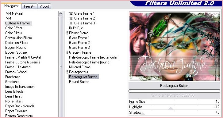 13 - Placer votre signature1 4 - Calques/Fusionner Tout15 - Effets/Unlimited/Buttons & Frames/Rectangular Button :