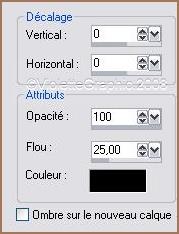 10 - Effets/Effets de bords/Accentuer 11 - Effets/Effets 3D/Ombre Portée : 0/0/100/25/couleur noire