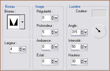 15 - Image/Ajouter des bordures : 5 pixels couleur foncée 16 - Sélection/Sélectionner Tout 17 - Sélection/modifier/Contracter de 5 pixels 18 - Effets/Effets 3D/Biseautage intérieur :