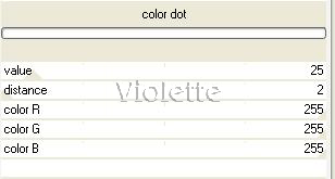 11 – Sélection/Sélectionner Tout 12 - Sélection /Modifier/Contracter de 25 pixels 13 - Sélection/Inverser 14 - Effets/ Pentacom/ Color and Dot :