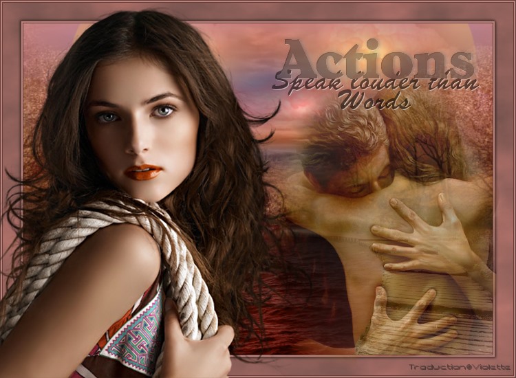 *** 1 - Ouvrir vos tubes ( ouvrir les calques) , les dupliquer et fermer les originaux Installer en premier plan la couleur #c67d74 et en arrière-plan la couleur #584340 2 – Ouvrir une nouvelle image de 750 x 550 pixels transparente Remplir de couleur avant-plan 3 - Calques / Nouveau calque 4 - Sélection/Sélectionner tout 5 – Ouvrir le tube "12_5_06cebarre2_sw"/Edition/Copier/Edition/coller dans la sélection Déplacer dans la partie supérieure gauche Désélectionner 6 - Dupliquer/Image/Miroir 7 – Ouvrir le tube "actions1"/Edition/Copier/Edition/coller comme nouveau calque Placer dans la partie inférieure gauche Mode du calque : Luminance héritée 8 – Ouvrir le tube "actions2"/Edition/Copier/Edition/coller comme nouveau calque Placer dans la partie inférieure droite A l'aide de la gomme ou de l'outil sélection lasso enlever la partie gauche du pont 9 - Calques/Fusionner Tout