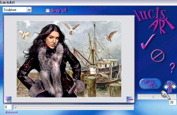 6 - Calques/Fusionner Tout 7 - Réglages/Netteté/Davantage de Netteté 8 - Activer le tube "Jet-woman17-februari-2008"/Copier/Coller comme nouveau calque Image/Miroir Centrer sur le pont 9 - Activer le tube "Mtm_Birds 10-Las Tres almas de Dios" Choisir trois ou quatre oiseaux entre tous et les placer entre le ciel et la terre 10 - Calques/Fusionner les calques visibles 11 - Effet/LucisArts /Sculpture: