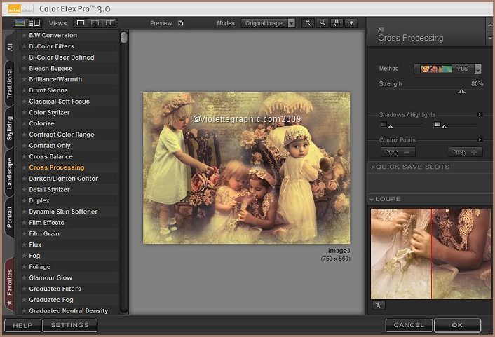 8 - Calques/ Fusionner les calques visibles 9 - Effets/Color efex Pro/Cross processing Method Y06