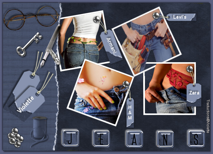 10 – Calques/Fusionner tout 11 - Calques/Nouveau calque/Choisir une police de votre choix et écrire vos textes sur les tags 12 - Activer le tube lettre « Jeans »/ Edition/Copier/Edition/ coller comme nouveau calque pour chaque lettre Effets/Effets 3D/Ombre Portée : -4 /-4/50/5/couleur blanche 13 - Activer le tube llave( clé )/ Edition/Copier/Edition/ coller comme nouveau calque Placer sur le papier 2 /Faire une ombre portée 14 - Activer le tube « tags » /Choisir deux tags / Edition/Copier/Edition/ coller comme nouveau calque Placer sur le papier 2 /Faire une ombre portée 15 - Activer le tube hilo( bobine de fil)/ Edition/Copier/Edition/ coller comme nouveau calque Placer sur le papier 2 /Faire une ombre portée 16 - Activer le tube boligrafo( stylo )/ Edition/Copier/Edition/ coller comme nouveau calque Placer sur le papier 2 /Faire une ombre portée 17 - Activer le tube « gafas » ( lunettes) / Edition/Copier/Edition/ coller comme nouveau calque Placer sur le papier 2 /Faire une ombre portée 18 - Activer le tube screws( punaise )/ Edition/Copier/Edition/ coller comme nouveau calque de façon à en placer 6 19 - Calques/Fusionner tout 20 - Calques/nouveau calque/Placer votre signature 21 – Image/Ajouter des bordures : 10 pixels de couleur blanche sélectionner avec la baguette magique / Remplir de couleur #505676 22 – Sélection/Inverser 23 - Effets/Effets 3D/Ombre Portée : 3 /3/50/5/couleur noir Faire une seconde fois avec -3 24 - Calques /Fusionner Tout 25 – Exporter en JPEG Optimisé