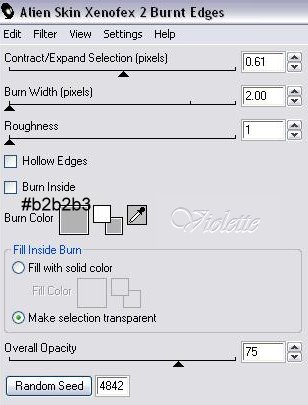 12 - Sélection/Sélectionner Tout Sélection/modifier/Contracter de 20 pixels Calques/Nouveau calque/remplir de blanc Sélection/modifier/Contracter de 20 pixels Appuyer sur la touche "Suppr" Désélectionner Effets/Alien Skin Xenoflex2/Burnt Edges :