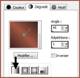 2 - Placer en avant-plan la couleur #38221f et en arrière-plan la couleur #a25742Dans la Palette de Style Configurer un dégradé linéaire angle: 45°/Répétition : 1