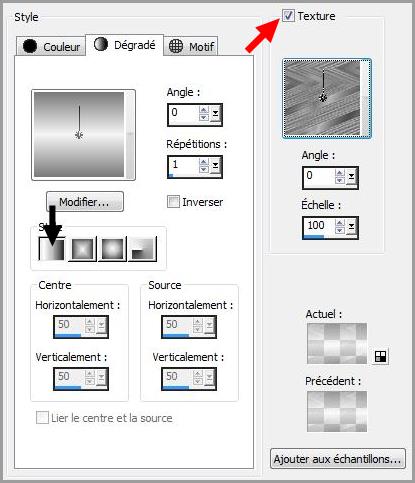 Remplir de dégradé linéaire angle: 0°/Répétition : 1 décocher le volet texture