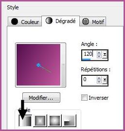 2 - Placer en avant-plan la couleur #550f4f et en arrière-plan la couleur #c75a9fDans la Palette de Style Configurer un dégradé linéaire/ angle: 120°/Répétition : 0