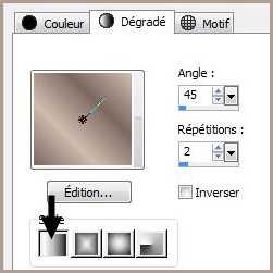 2 - Ouvrir une image transparente de 900 x 600 pixels Remplir de dégradé linéaire/angle: 45° /Répétitions : 2/Inverser non coché premier-plan couleur #7d6961/ arrière-plan couleur # cfbcae