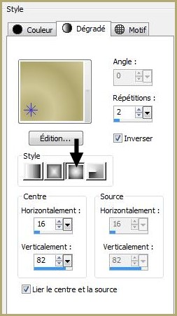 2 - Ouvrir une image transparente de 800 x 600 pixels **Remplir de dégradé formé des couleurs : premier-plan couleur # cfc798/ arrière-plan couleur #afa66dconfiguré : halo/Répétitions : 2/ inverser coché Centre : H= 16/ V= 82