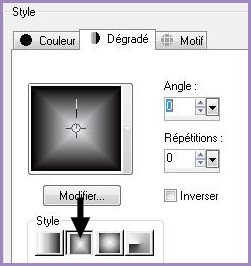 2 - Placer en avant-plan la couleur #040000 et en arrière-plan la couleur #f2f1f7Dans la Palette de Style Configurer un dégradé rectangulaire /angle : 0/ répétition : 0