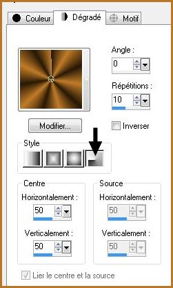 2 - Placer en avant-plan la couleur #271907 et en arrière-plan la couleur #c17b28Dans la Palette de Style Configurer un dégradé radial angle: 0°/Répétitions : 10