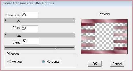 12 - Sélectionner la bordure transparente avec la baguette magique ( valeur: RVB /Tolérance et Progressivité à 0 /intérieur) **Couches/Nouveau calque remplir de dégradé linéaire angle: 50°/Répétitions : 5 **Effets/DSB Flux/Linear Transmission réglages suivants :