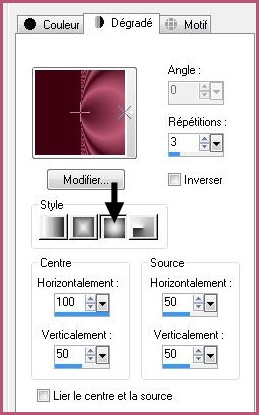 2 - Placer en avant-plan la couleur #3f0311 et en arrière-plan la couleur #bd5a77**Dans la Palette de Style Configurer un dégradé halo/Répétitions : 3 Centre : H=100/ V=50