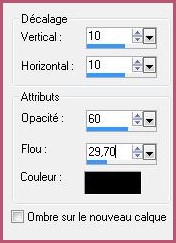 13 - Activer de nouveau le tube Maxyran_10_11_09 Women126.pspimage Modifier/Copier/Modifier/Coller comme nouveau calque Placer comme sur l'image finale **Effets/Effets 3D/Ombre Portée réglages suivants :
