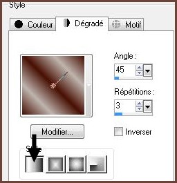 2 - Placer en avant-plan la couleur #491003 et en arrière-plan la couleur #bdb4ae**Dans la Palette de Style Configurer un dégradé linéaire angle : 45°/Répétitions : 3