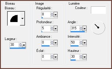 14 - Image/Ajouter des bordures : 5 pixels couleur #e1dedbSélectionner la bordure avec la baguette magique ( valeur: RVB /Tolérance et Progressivité à 0 /intérieur) ** Effets/Graphic Plus/Cross Shadow réglages par défaut** Effets/Effets 3D/Biseautage Intérieur réglages suivants :