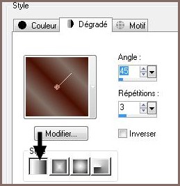 2 - Placer en avant-plan la couleur #491003 et en arrière-plan la couleur #827067**Dans la Palette de Style Configurer un dégradé linéaire angle : 45°/Répétitions : 3