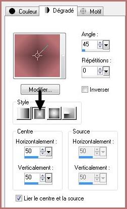 2 - Placer en avant-plan la couleur #583539 et en arrière-plan la couleur #b97174Dans la Palette de Style Configurer un dégradé rectangulaire angle: 45°/Répétition : 0