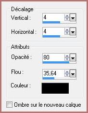 **Sélection/Inverser Effets/Effets 3D/Ombre Portée : 4/4/80/35,64 /couleur #000000 Répéter avec des valeurs négatives : -4 en décalage vertical et horizontal Sélection/Ne rien sélectionner
