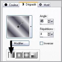 2 - Ouvrir une image transparente de 900 x 600 pixels Placer en avant-plan une couleur claire et en arrière-plan une couleur foncée Configurer un dégradé linéaire angle: 45°/Répétitions: 4