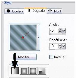 3 - Placer en avant-plan une couleur claire et en arrière-plan une couleur foncée assorties au tube Configurer un dégradé linéaire angle: 45°/Répétitions: 10
