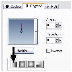 3 - Placer en avant-plan une couleur claire et en arrière-plan une couleur foncée assorties au tube Configurer un dégradé linéaire angle: 0°/Répétition: 0