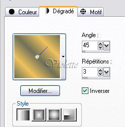 Entrer le texte "Luminous" Taille 120 pour la lettre "L"/ taille 90 pour "uminous" Placer dans le coin inférieur gauche 15 - Dupliquer se placer sur le calque inférieur Effets / Effets de distorsion/ vent à droite de 100 16 - Image / Ajouter des bordures : 1 pixel couleur #e0e1e5 17 - Image / Ajouter des bordures : 20 pixels couleur noire / Sélectionner avec la baguette magique- Placer en avant-plan la couleur # eec15e et en arrière - plan la couleur # 6e7159et configurer un dégradé linéaire angle 45° répétition : 3 inverser cochée