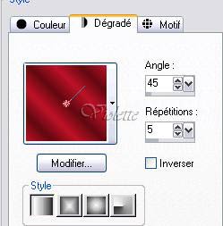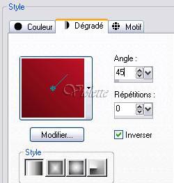 *** Vous trouverez le tutoriel original avec les tubes fournis ICIj'ai choisi de réaliser ce tutoriel dans les tons rouges 1 - Ouvrir les tubes, les dupliquer et fermer les originaux installer vos filtres 2 - Placer en avant-plan la couleur #bd1326 et en arrière-plan la couleur #610a11 Configurer le dégradé linéaire angle : 45° répétition : 0 inverser non coché