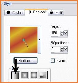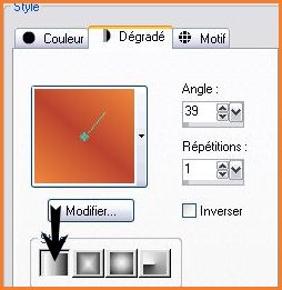 2 - Placer en avant-plan la couleur #ED863B et en arrière-plan la couleur #BB4330Configurer le dégradé linéaire angle : 39° /répétition : 1/ inverser non coché