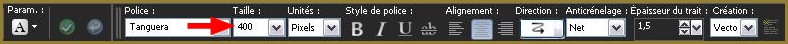 17 - Activer l'outil Texte/Police Tanguera /Taille : 400/ Trait : 1,5 /vectorielcouleurs : même configuration qu'au début