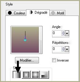 2 - Placer en avant-plan la couleur #754b64 et en arrière-plan la couleur #b0b08eConfigurer le dégradé linéaire /angle : 0°/Répétition: 0