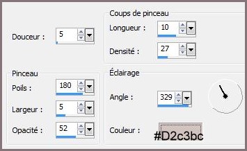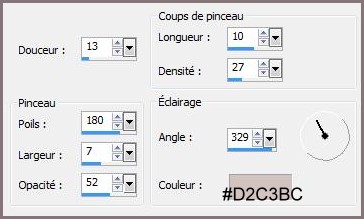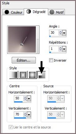 ** Placer en avant-plan la couleur #43313c et en arrière-plan la couleur #d2c4bc**Configurer le dégradé rectangulaire /angle : 30°/Répétition: 1 Centre : Hor.=50/ Vert.=70