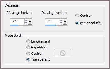 16 - Activer le tube Mary%20081211-11[1].pspimageModifier/Copier/Modifier/Coller comme nouveau calque Image/Redimensionner à 70%/décocher " Redimensionner tous les calques" Image/Renverser horizontalement ( Miroir) **Effets/Effets d'image/décalage :