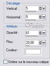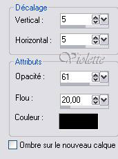 Effets/Graphic Plus/Cross Shadow par défaut Edition/Coller comme nouveau calque Sélection/ Sélectionner Tout / Sélection flottante/Sélection statique Effets /Effets 3D/ Ombre Portée : 5/5/61/20/noir Répéter avec des valeurs négatives : -5 en décalage vertical et horizontal