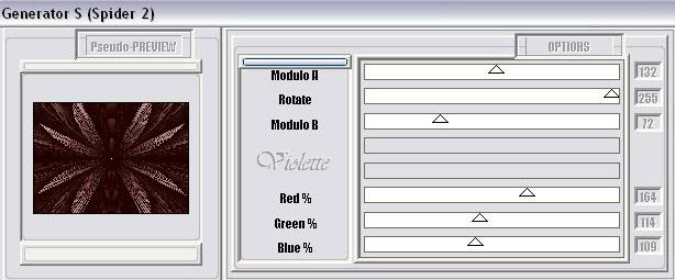 3 - Ouvrir une image transparente de 700 x 500 pixels /Remplir de dégradé 4 - Dupliquer Sélection/Sélectionner Tout Activer l'image 051.pspimage / Edition/Copier/Edition/Coller dans la sélection Désélectionner Effets/Effets de bords /Accentuer 5 - Effets / Krusty's FX Vol.II 1.0 Generator S ( Spider 2 )