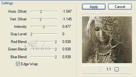 6 - Ouvrir le tube e&eSoleil-0130 /Copier/Coller comme nouveau calque Placer sur la gauche Mode du calque : Luminance Héritée 7 - Dupliquer Mode du calque : Multiplier Opacité à 48% 8- Se placer sur le calque du tube original et appliquer deux fois l'e ffet Blend Emboss avec les mêmes paramètres9 - Ouvrir le tube Send_me_an_Angel_misted_na_10.09.2006 /Copier/Coller comme nouveau calque 10 - Dupliquer Opacité à 46% Mode du calque : Multiplier puis Recouvrement 11 - Avec la baguette magique / sélectionner la chevelure de la femme