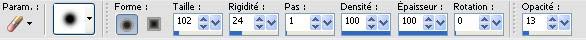 32 - Dupliquer /Image/Miroir 33 - Déplacer un peu sur la gauche Opacité à 36% Avec l'outil gomme paramétré ainsi :