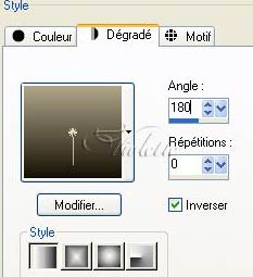 40 - calques /Supprimer/oui/Calques /Fusionner le groupe 41 - Image/miroir 42 - Répéter le n° 39 /Image/miroir 43 - calques /Nouveau calque Installer la couleur #171005 en avant-plan et la couleur #afa689 en arrière-plan remplir de dégradé linéaire angle 180° répétition 0 inverser coché