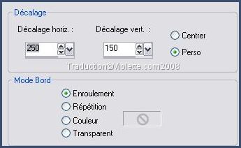 4 - Réglages/Flou/Flou gaussien : rayon : 5 /monochrome 5 - Effects/Image Effects/Décalage : H=250/V=150/perso/Enroulement