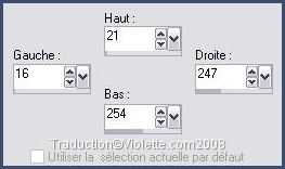 35 - Activer le calque supérieur Calques/Nouveau calque Activer l'outil Sélection/ Sélection Personnalisée: T=21 / L=16 / R=247 / B=254