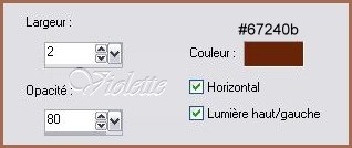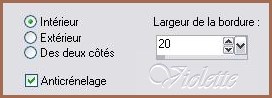 16 - Sélection/Modifier/Sélectionner les bords de la sélection: Intérieur / 317 - Peindre avec la couleur foncée 18 - Effets/3D Effets/Ombre Portée : -1/1/70/3/#000000 Sélection/Désélectionner